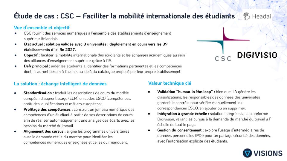 Dans un second temps, le webinaire a montré comment cette logique peut être étendue à plus grande échelle avec le projet CSC en Finlande. Ici, l’enjeu n’est plus seulement l’orientation locale, mais la capacité à connecter plusieurs établissements pour faciliter la mobilité internationale. La solution repose sur la standardisation des données (ESCO). Cela permet de créer un “jumeau de compétences” pour chaque étudiant, puis d’analyser les écarts avec les besoins du marché du travail. À partir de là, l’IA peut recommander des formations pertinentes, y compris en dehors du catalogue de l’établissement d’origine.