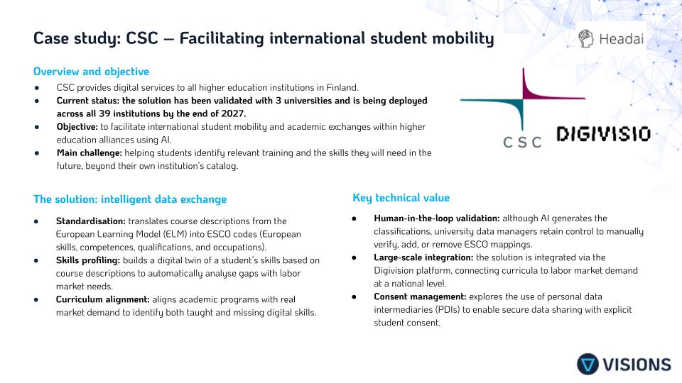 The CSC project in Finland extends this approach to a national level. The objective is to enable students to identify relevant learning opportunities beyond their home institution. The solution relies on data standardisation using ESCO. This enables the creation of a “skills twin” for each student, allowing AI to analyse skill gaps and recommend suitable learning paths.